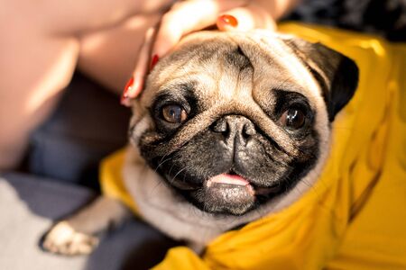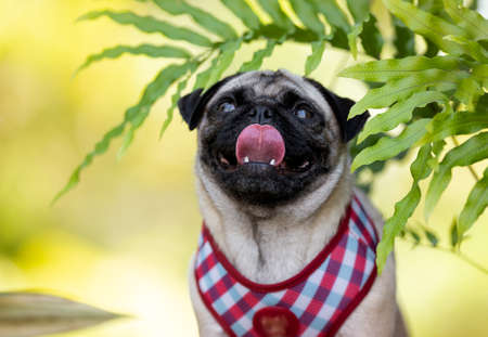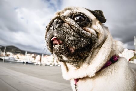 Pug for a walk. domestic dog. Favorite pet. looking into the camera.