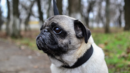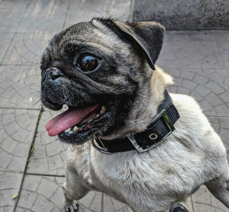 Portrait of a pug dog with black collar on the street