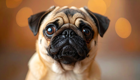 A close-up portrait captures the soulful and endearing expression of a pug. With its big, glossy eyes and wrinkled brow, the dog looks directly at the viewer, creating an intimate connection. The warm, glowing bokeh lights in the background add a touch of magic and coziness to the scene, highlighting the pets gentle and loving nature.