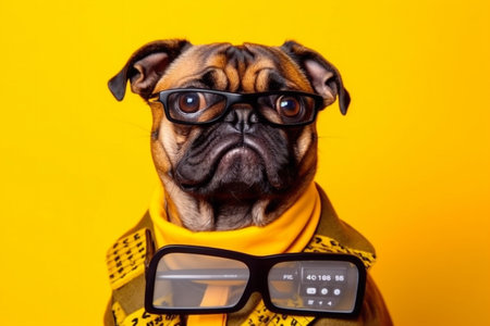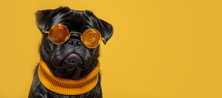 Black pug wearing a yellow sweater and glasses on a yellow background.