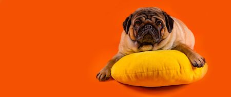 Cute dog resting on orange background.