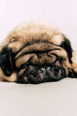 A beautiful sad pug lies on isolated white background. Cute pug puppy dog isolated on white background