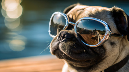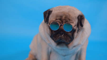 Cute pug in small sunglasses on blue background. Portrait of relaxed dog. Close up