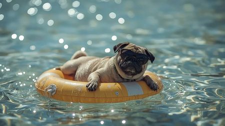 A relaxed pug lounges on a bright orange life ring in sparkling water under a clear sky. The dog wears sunglasses while soaking up the sun, embodied summertime chill.