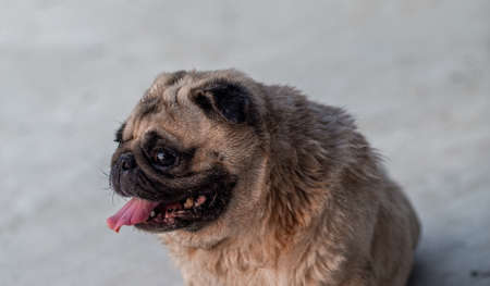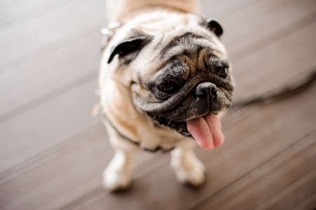 Cute adorable pug with putting his tongue out on the blurred background of wooden floor