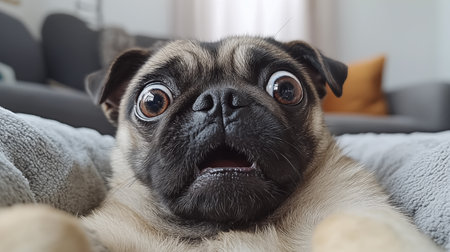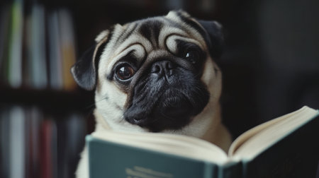 A charming pug dog with big, expressive eyes appears to be reading a book, creating a delightful and whimsical scene that highlights the bond between pets and literature.