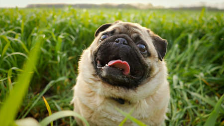 Cute pug dog sitting in a green field and yawning