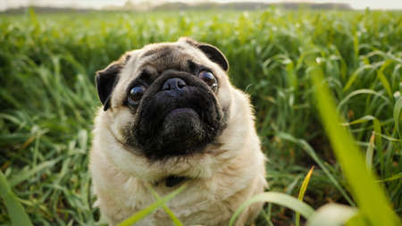 Cute pug dog sitting in green grass and looking at camera