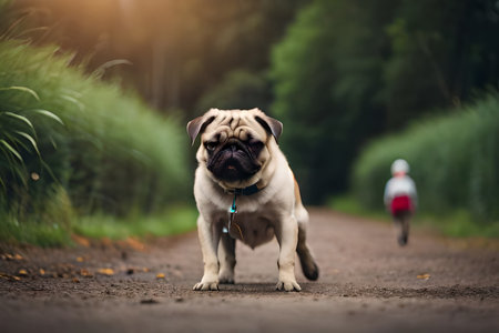 A pug dog on a dirt road with a green background. AI Neural Network Generated Art Wallpaper
