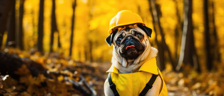 Dog In Halloween Costume In Woodsdog Wearing Construction Helmet On Vibrant Yellow Background. Сoncept Halloween Costumes For Dogs, Dogs In The Woods, Dogs Wearing Construction Helmets.