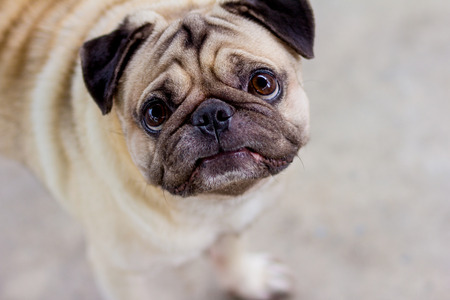 Close-up photo of Pug dog.Pug dog looking at camera with a still expression on its face.