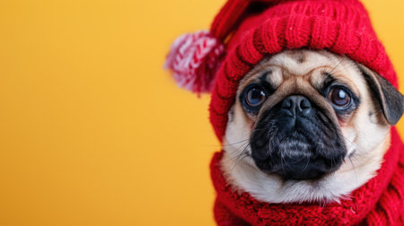 A charming pug in a stylish red hat and scarf, set against a vivid yellow backdrop. This image captures the festive spirit and warmth of pets during winter.