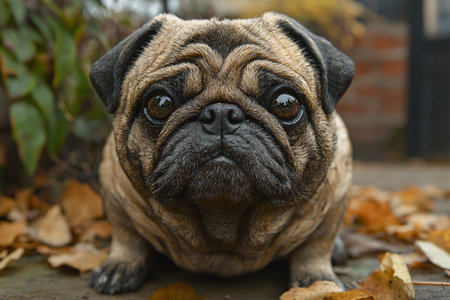 A full-bodied, overweight pug is lounging comfortably amidst colorful autumn leaves, enjoying a tranquil moment in a serene garden space.