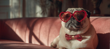 A stylish pug wearing oversized heart-shaped sunglasses and a bowtie sits on a pink sofa. The cozy home interior is bathed in warm morning light, creating a charming lifestyle scene.