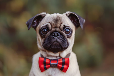A funny pug with a red bow tie looking at the camera on green grass during summer. Emotion of suspicion. Copy space. Wedding. Close-up