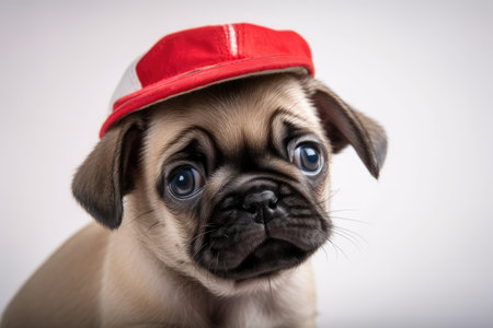 Pug dog wearing warm red hat with a pompom. Winter time. Animal clothing. Generative Ai technology.
