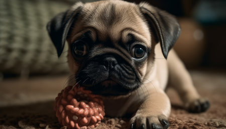 Cute pug puppy with toy in mouth on the carpet.