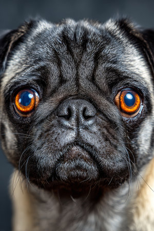 Close-Up of a Charming Pug with Expressive Eyes, Captivating Pet Photography Against Gray Background