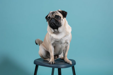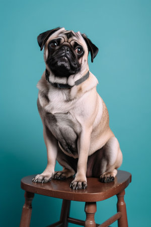 An AI generated illustration of a cute pug dog on a stool in a soft blue background