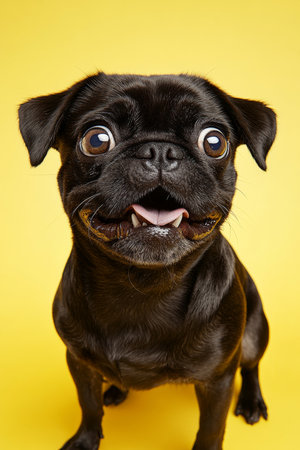 Angry and surprised Pug isolated on a yellow background, with its wrinkled face and eyes full of playful surprise.