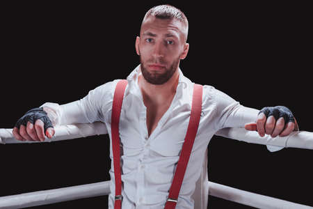 Images of a bearded man in a white shirt and red suspenders in the ring. The concept of fist underground fights. Mixed media