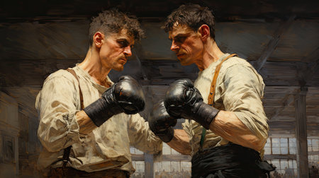 Black and white silhouettes of boxing athletes in the ring. Combat sports. Shallow depth of field, focus on the hands of athletes.