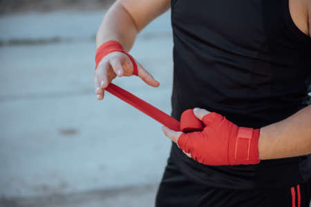 Closeup male hand of boxer with red boxing bandages. Boxing man binds the bandage on his hand, before training, detail photo