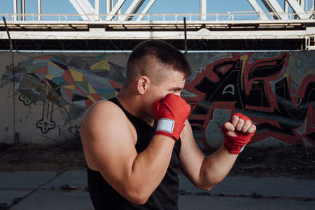Man exercising and fighting in outside, boxer in gloves. male boxer portrait