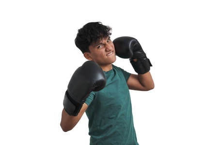 Young peruvian boxer throwing a chopping right. Isolated over white background.