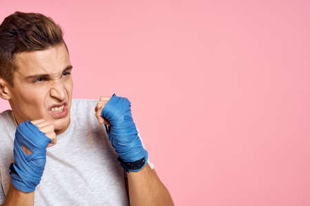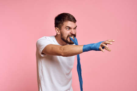 Sporty man in a white T-shirt boxing bandages on the hands of a workout lifestyle pink background
