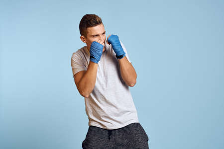 sports man in white t-shirt blue boxing bandages on his arms workout exercises
