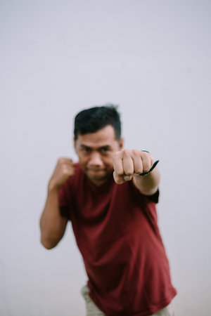 A man throwing a direct punch, showcasing determination and fitness against a plain backdrop
