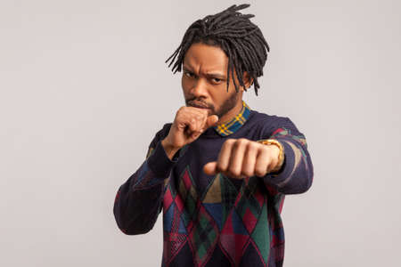 Confident concentrated african guy with dreadlocks and beard holding clenched fists, ready to make a blow, shadow boxing, self defense. Indoor studio shot isolated on gray background