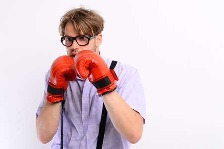 Young boxer. Man in boxing gloves. Sport lifestyle. Sport motivation. Full concentration. Dare to be great. Handsome young man isolated. Confident concept. Man boxing.