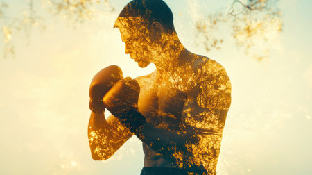 A boxer in a striking pose is captured in silhouette, uniquely blended with glowing jogging trails and energetic outdoor elements during dawn.