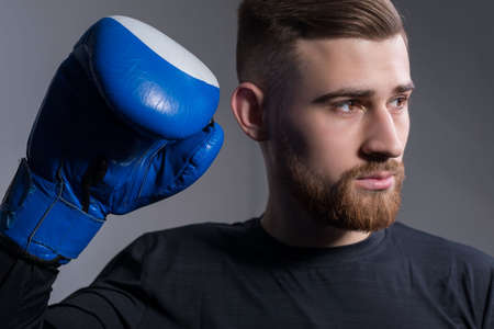 Portrait of handsome bearded brutal guy in sportswear standing in a combat pose, holding raised hands near his face, in boxing gloves. On a gray background.