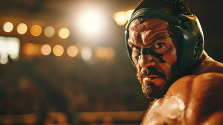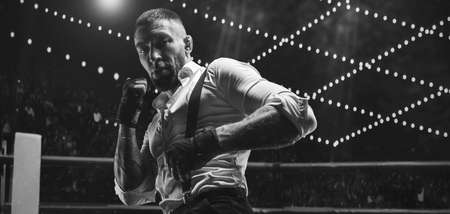 Brutal man fighter stands in the ring against the background of the arena and spotlights. He looks threateningly at the camera. The concept of fist fights. Mixed media