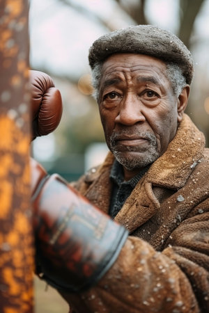 Elderly man engaging in fitness training with a punching bag at a boxing gym facility