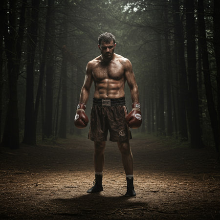 Handsome muscular boxer standing in dark forest with boxing gloves.