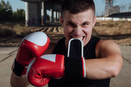 man boxer punching. fitness gym outdoor. muscular athletic guy training in boxing gloves
