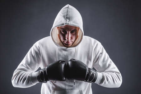 Young man in boxing gloves and a white sweatshirt on a dark background in the studio. The concept of victories and battles