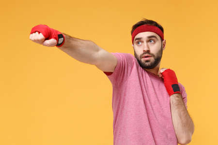 Young bearded fitness sporty guy 20s sportsman in headband t-shirt spend weekend in home gym isolated on yellow background. Workout sport motivation concept. Boxing with sports bandages on hands.