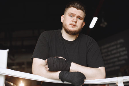 Image of a brutal man sitting in the corner of the ring. He looks defiantly at his opponent. The concept of fist fights. Mixed media