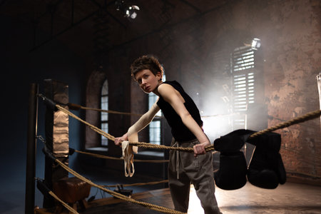 A woman in a boxing gym, portrait by the ropes, cinematic style, dark tones. Training and overcoming oneself, motivation