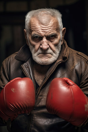 Handsome elderly man practicing boxing kicks - close up portrait. Healthy fighter senior old man boxing gloves. Grandfather doing boxing training in morning.