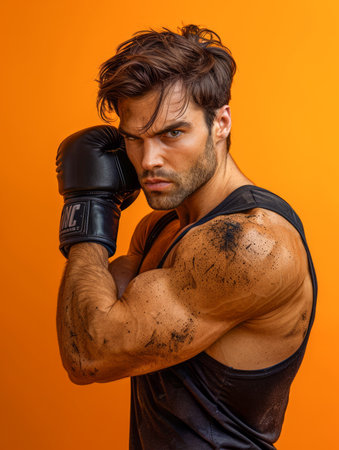 Confident Muscular Male Boxer in Black Gloves Posing Against Vibrant Orange Background, Athletic Fighter AI Generative