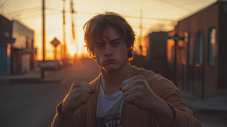 A young man clenches his fists and grits his teeth while standing on an empty street at sunset.