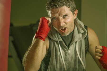 lifestyle gym portrait of young attractive and fierce looking man training boxing at fitness club doing heavy bag punching workout with hands and wrist wraps in badass fighter look