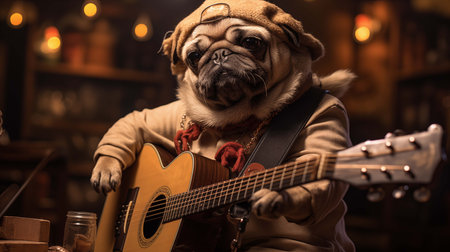 Dressed up pug dog musician ai generated character anthropomorphic. Guitar strumming pet long sleeve wearing whimsical animal portrait humanlike. Anthropomorphism concept photography photorealistic