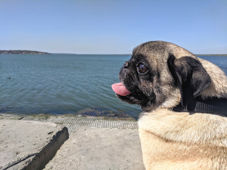 Pug dog looking at the lake on a sunny summer day.